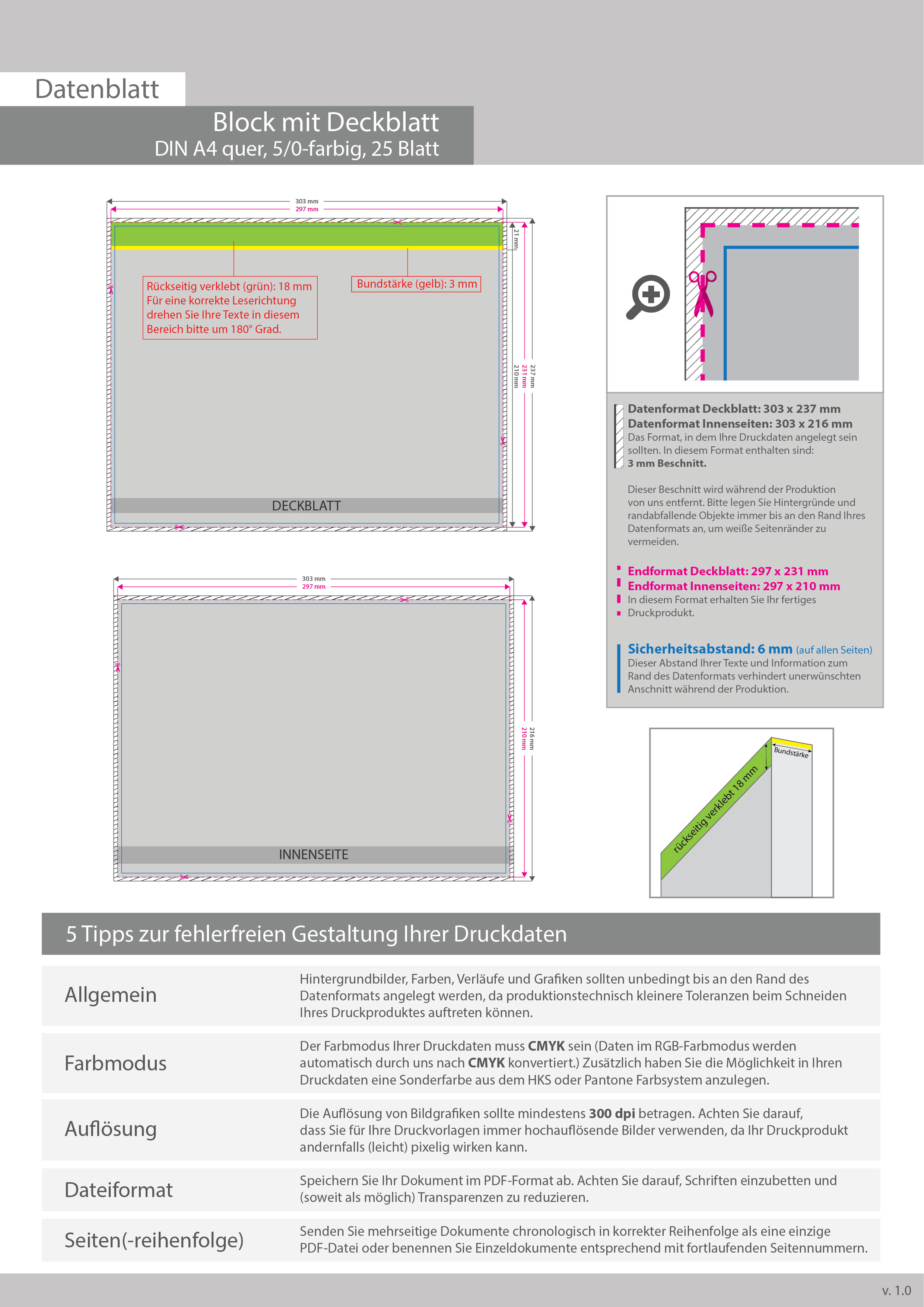 Block mit Leimbindung und Deckblatt, DIN A4 quer, 25 Blatt, 5/0 farbig einseitig bedruckt (CMYK 4-farbig + 1 Sonderfarbe HKS oder Pantone)