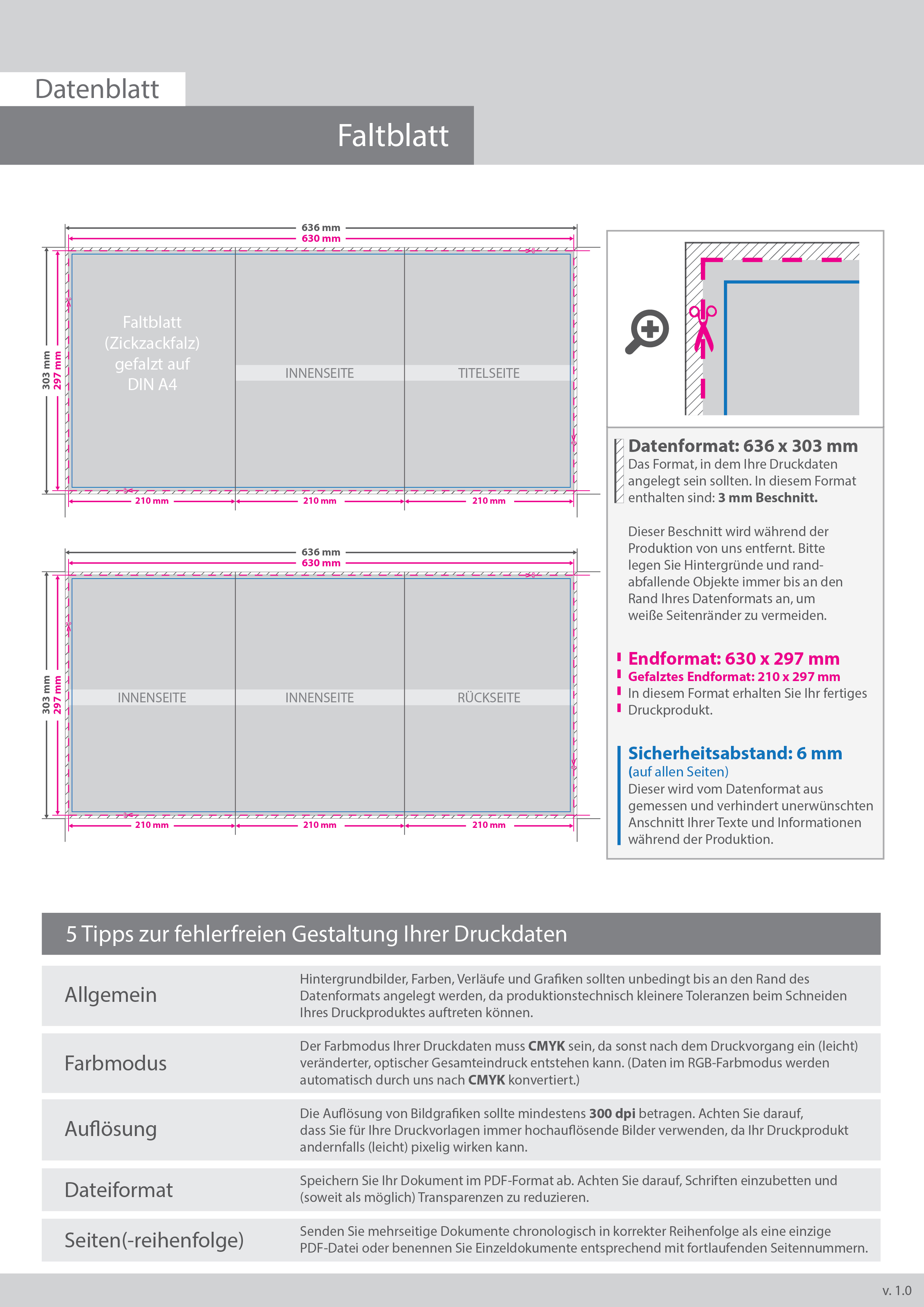 Hochglanz-UV-Lack Faltblatt, gefalzt auf DIN A4, vertikaler Zickzackfalz, 6-seitig