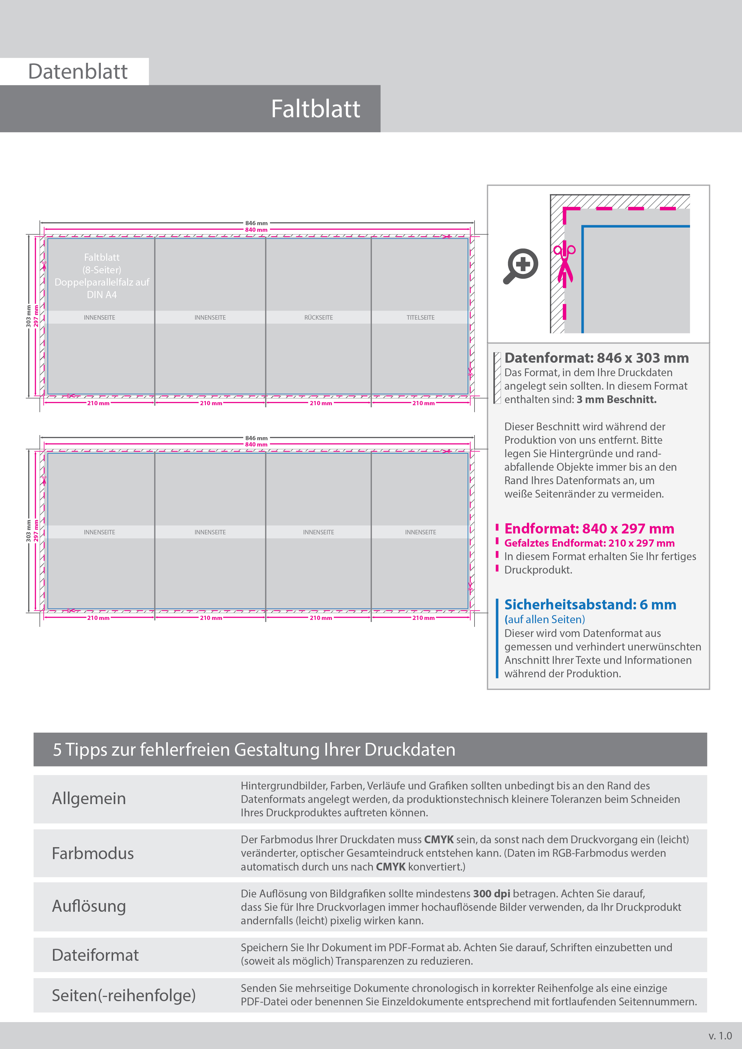 Hochglanz-UV-Lack Faltblatt, gefalzt auf DIN A4, vertikaler Doppelparallelfalz, 8-seitig